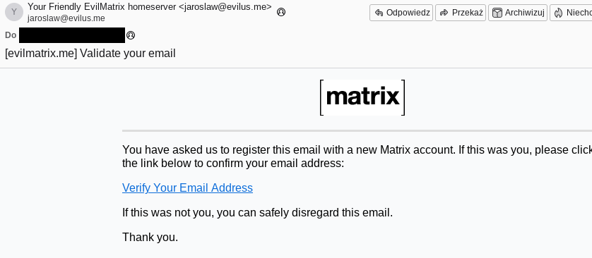 Tak jak w przypadku Jabbera, prowadzę także serwer Matrix, pod adresem evilmatrix.me:8448. I także tak jak w przypadku Jabbera, to jest serwer otwarty - każdy może się zarejestrować i używać. Oczywiście też jest sfederalizowany - można wysyłać i odbierać wiadomości do i od każdego użytkownika z i do każdego serwera Matrix.